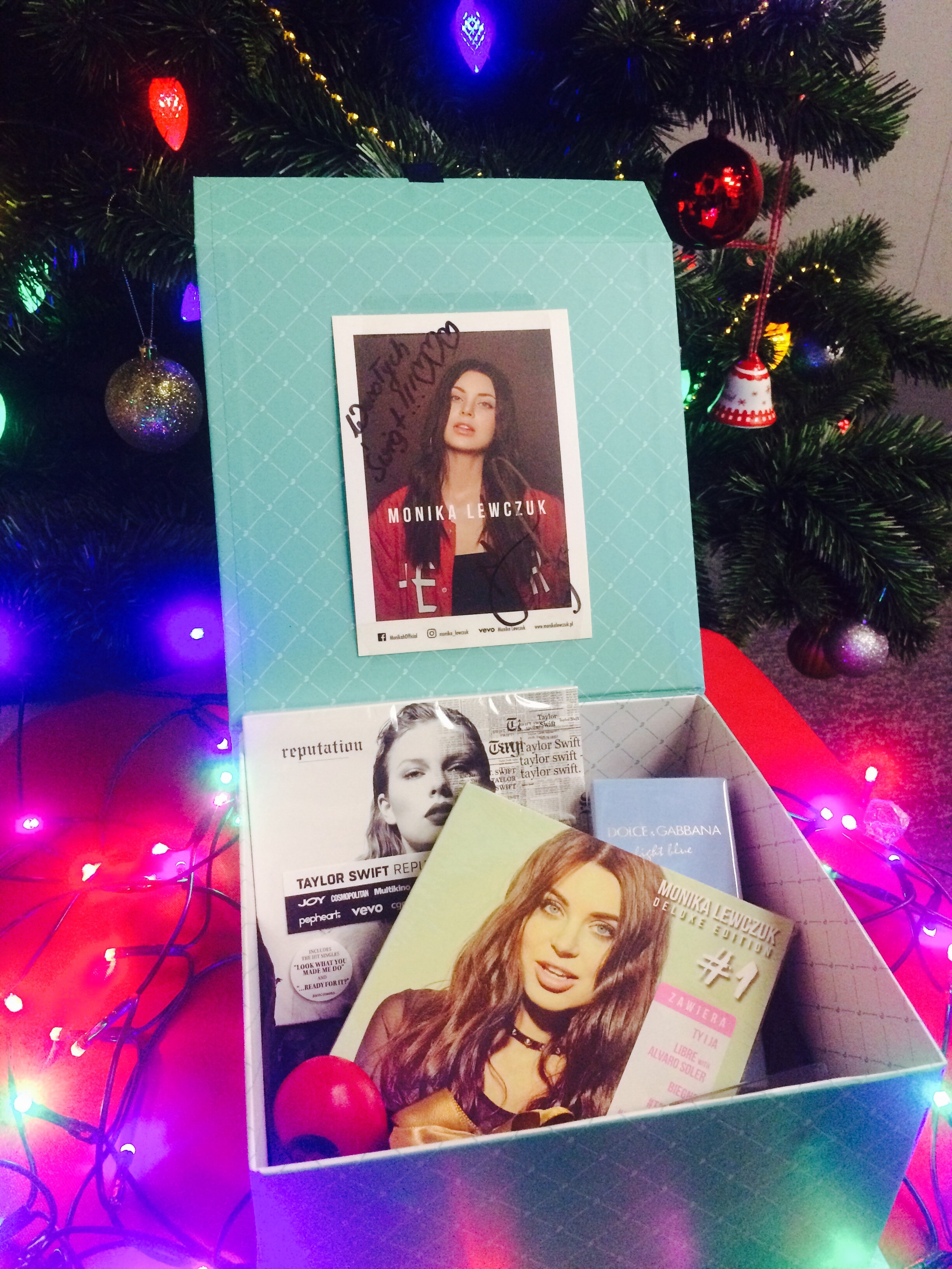 Od początku grudnia artyści przekazują nam prezenty i zawieszają na naszej radiowej choince ozdoby świąteczne, z którymi są osobiście związani. Właśnie dotarł do nas wyjątkowy prezent od Moniki Lewczuk. Piosenkarka przygotowała pudełko pełne upominków: znajdziemy w nim najnowszą płytę Taylor Swift "Reputation", krążek artystki "#1", perfumy, czekoladki. Jednak wśród tych prezentów, jest coś szczególnego: