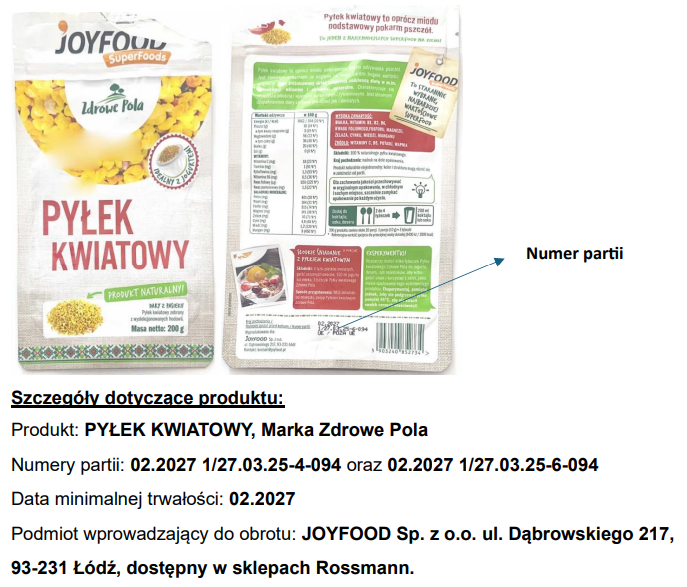Za pośrednictwem swojej strony internetowej sieć drogerii Rossmann zwróciła się do klientów z ważnymi informacjami o wycofaniu dwóch produktów. Pierwszy z nich to artykuł spożywczy – pyłek kwiatowy marki Zdrowe Pola. W dwóch partiach, oznaczonych: 02.2027 1/27.03.25-4-094 oraz 02.2027 1/27.03.25-6-094, w wyniku badań Państwowej Inspekcji Sanitarnej stwierdzono przekroczenie dopuszczalnego poziomu alkaloidów pirolizydynowych.