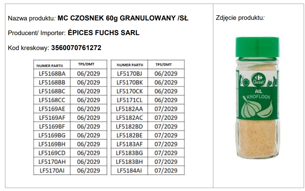 Carrefour prosi wszystkich klientów, którzy zakupili czosnek granulowany w słoiku o określonych numerach partii, aby nie spożywali produktu. Osoby uczulone na siarczyny lub je nietolerujące powinny szczególnie uważać. Sieć zaleca zwrot produktu do dowolnego sklepu Carrefour do dnia 19 października 2025 roku. Klienci otrzymają zwrot pieniędzy, nawet bez okazywania paragonu.