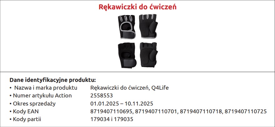 Kwestionowany artykuł to rękawiczki do ćwiczeń (numer artykułu Action: 2558553) z partii oznaczonych numerami 179034 i 179035. Mogą posiadać kody kreskowe: 8719407110695, 8719407110701, 8719407110718, 8719407110725.